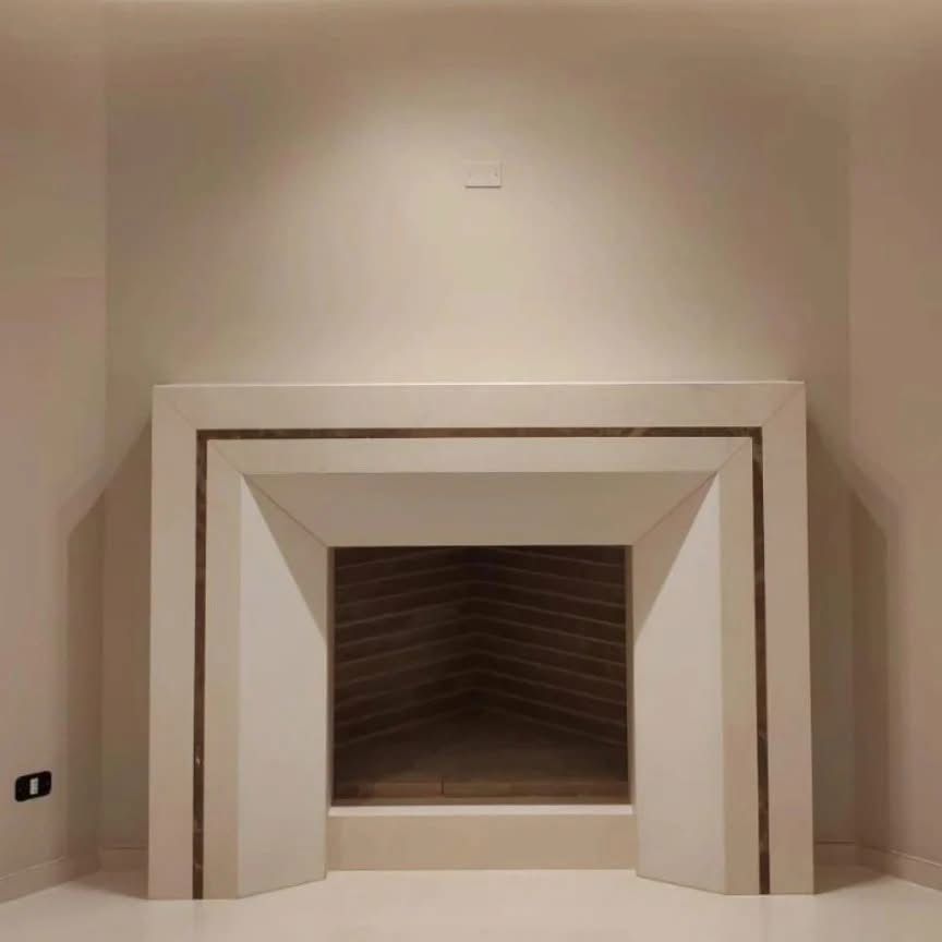 Camino realizzato in Limestone Bianco Anatolia con inserti in Marron Emperador
