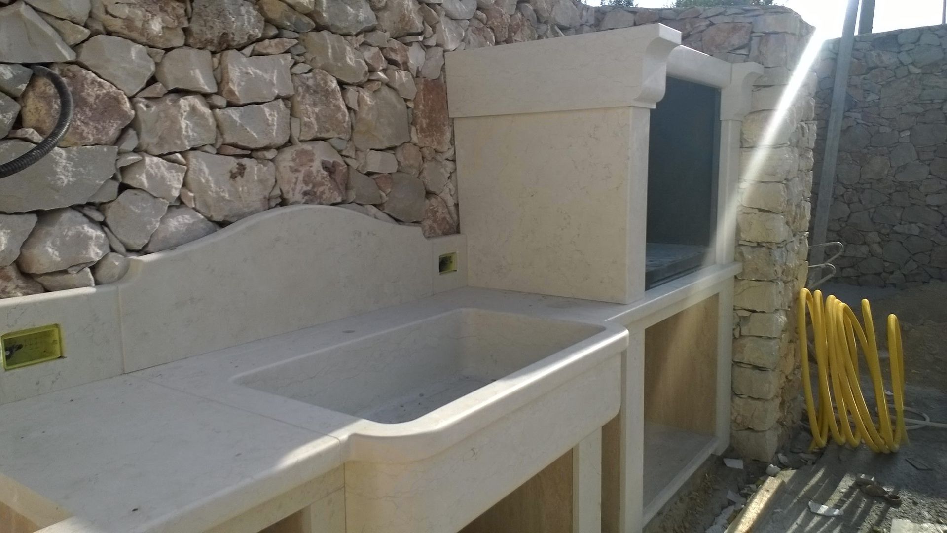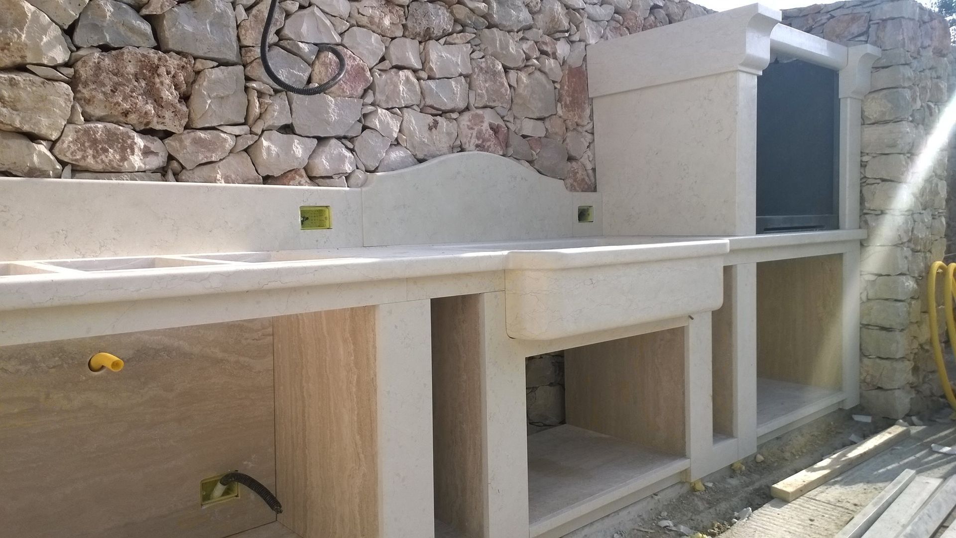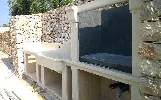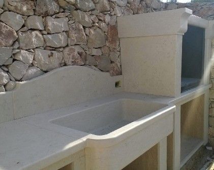 Cucina Barbecue realizzata in Bianco Perlino con lavandino integrato, interni in Travertino e piano fuoco in Pietra Lavica