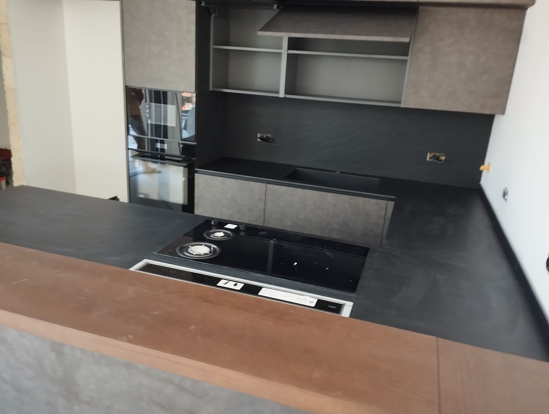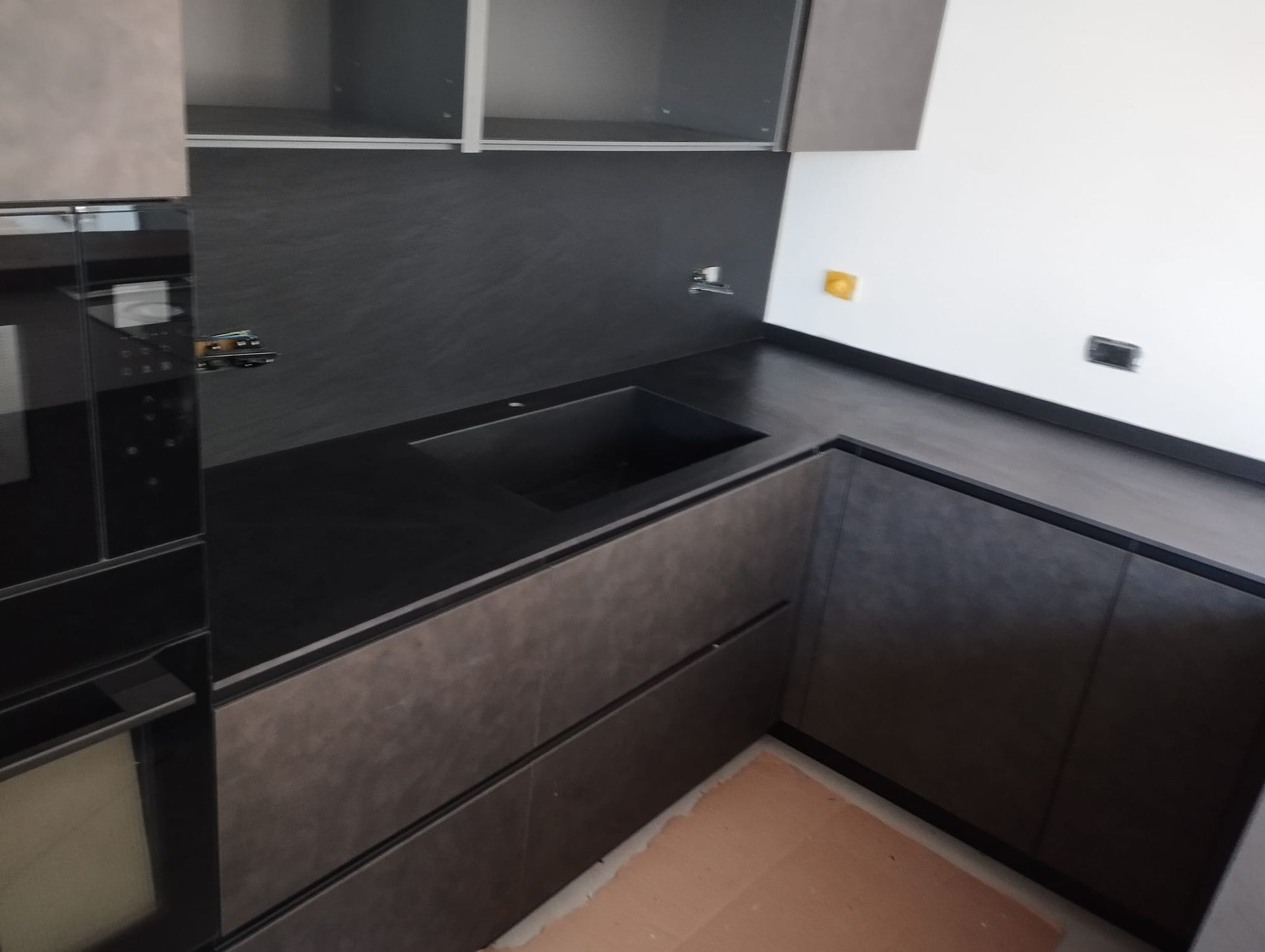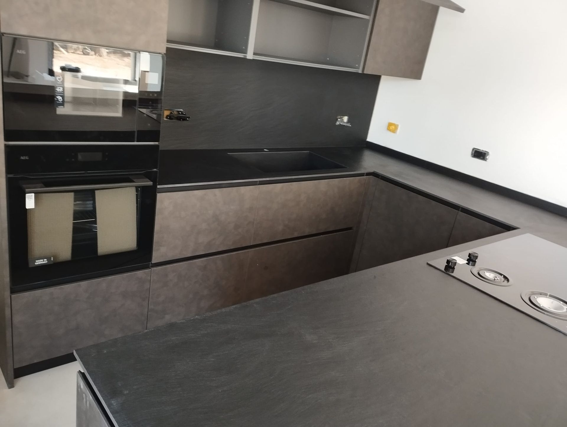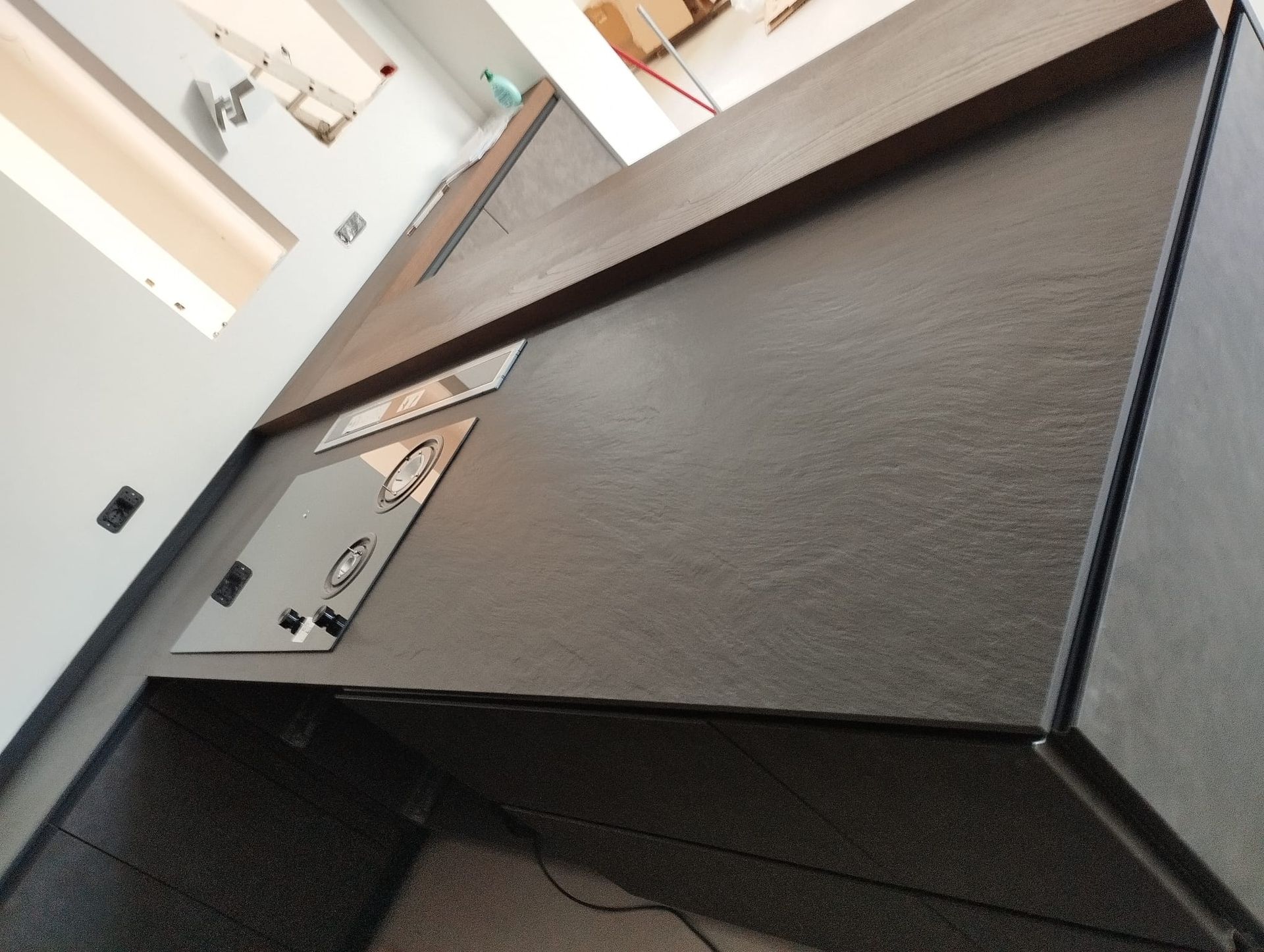 Top cucina realizzato in Gres Laminam Ardesia Nero a spacco con lavello integrato.